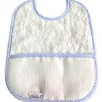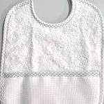 Babero con barra de panamá para poder bordar a punto de cruz y de suave rizo americano 500 gr/m2. El babero va ribeteado con tela vichy en Verde. “Colección Punto de Cruz”. Color “Blanco/Verde”. Fabricado por Martifanel en Portugal.