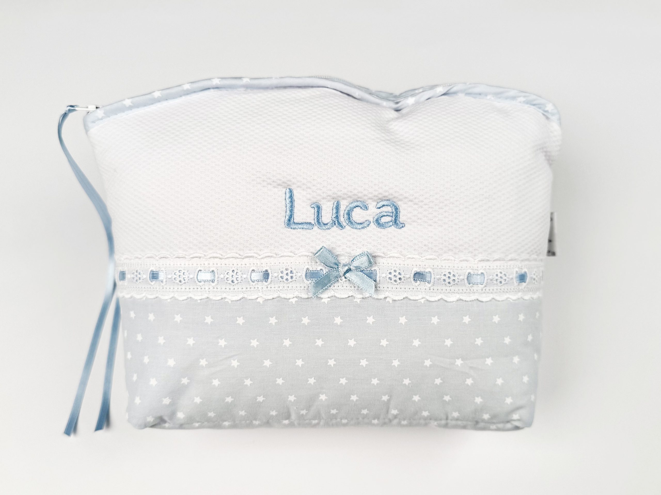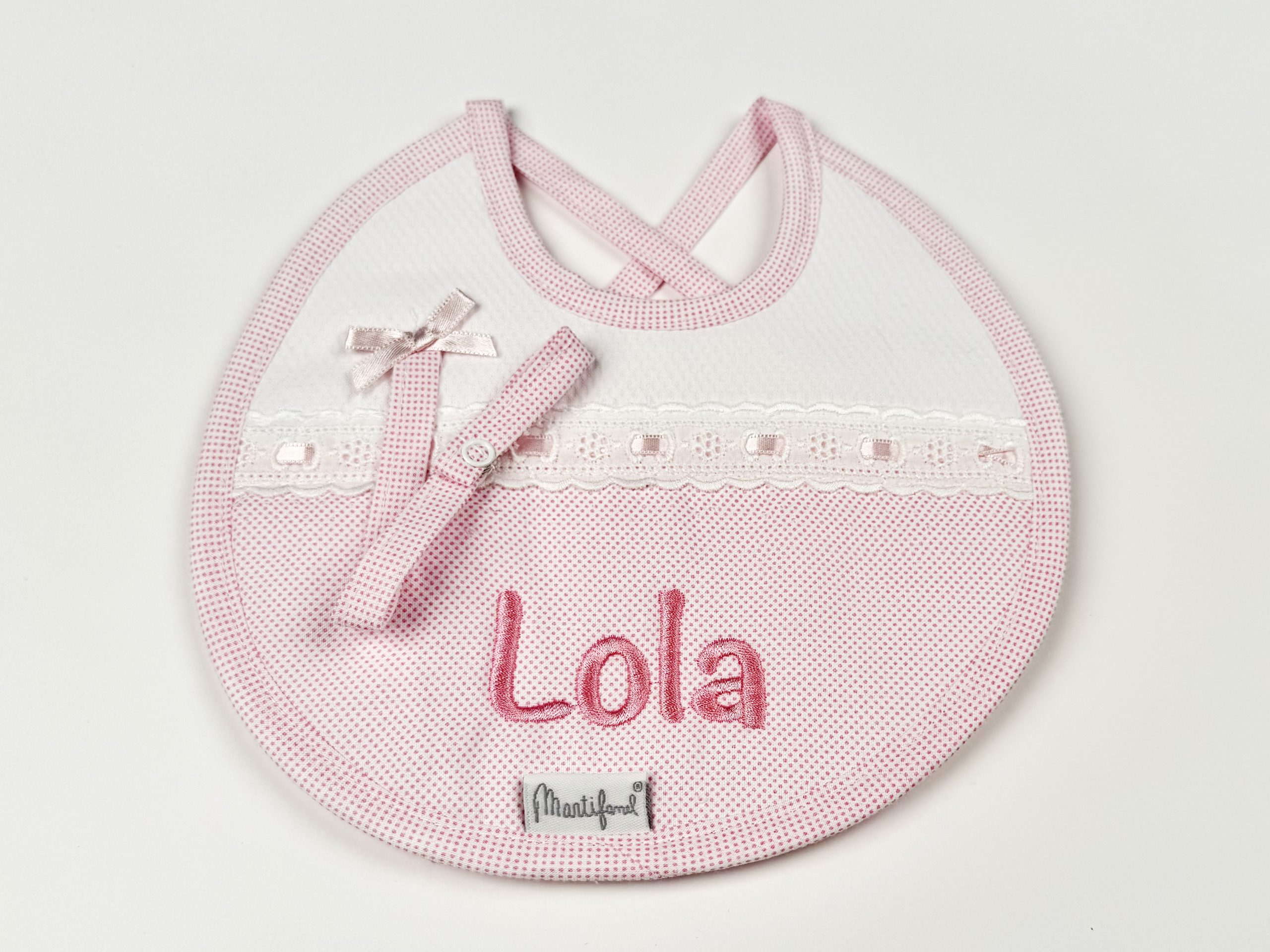 Babero con chupetero y lacito. Esponjoso al tener la parte trasera de suave felpa y la delantera decorado con piqué, tela estampada de estrellitas, puntilla y cinta a juego. Colección «Topitos». Color «Blanco/Rosa». Fabricación en Portugal. Marca Martifanel.