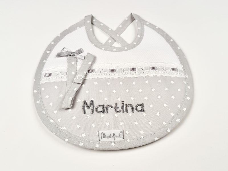Babero con chupetero y lacito. Esponjoso al tener la parte trasera de suave felpa y la delantera decorado con piqué, tela estampada de estrellitas, puntilla y cinta a juego. Colección «Estrellitas». Color «Blanco/Gris». Fabricación en Portugal. Marca Martifanel.