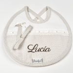 Babero con chupetero y lacito. Esponjoso al tener la parte trasera de suave felpa y la delantera en piqué, bordado con simpática frase bordada en lila. Dinos la frase que quieras y te la bordamos!! Color “Blanco/Lila”. Fabricación en Portugal. Marca Martifanel.