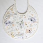 Simpático babero de la colección “Koala” ribeteado en azul. Parte trasera de felpa esponjosa y la delantera con la tela estampada de Koalas y ribeteado a tono. En 100% Algodón. Marca Martifanel. Fabricado en Portugal.