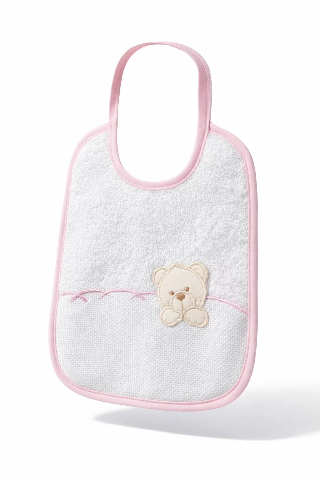 Simpático babero de la colección «Koala» ribeteado en azul petróleo. Parte trasera de felpa esponjosa y la delantera con la tela estampada de Koalas y ribeteado a tono. En 100% Algodón. Marca Martifanel. Fabricado en Portugal.