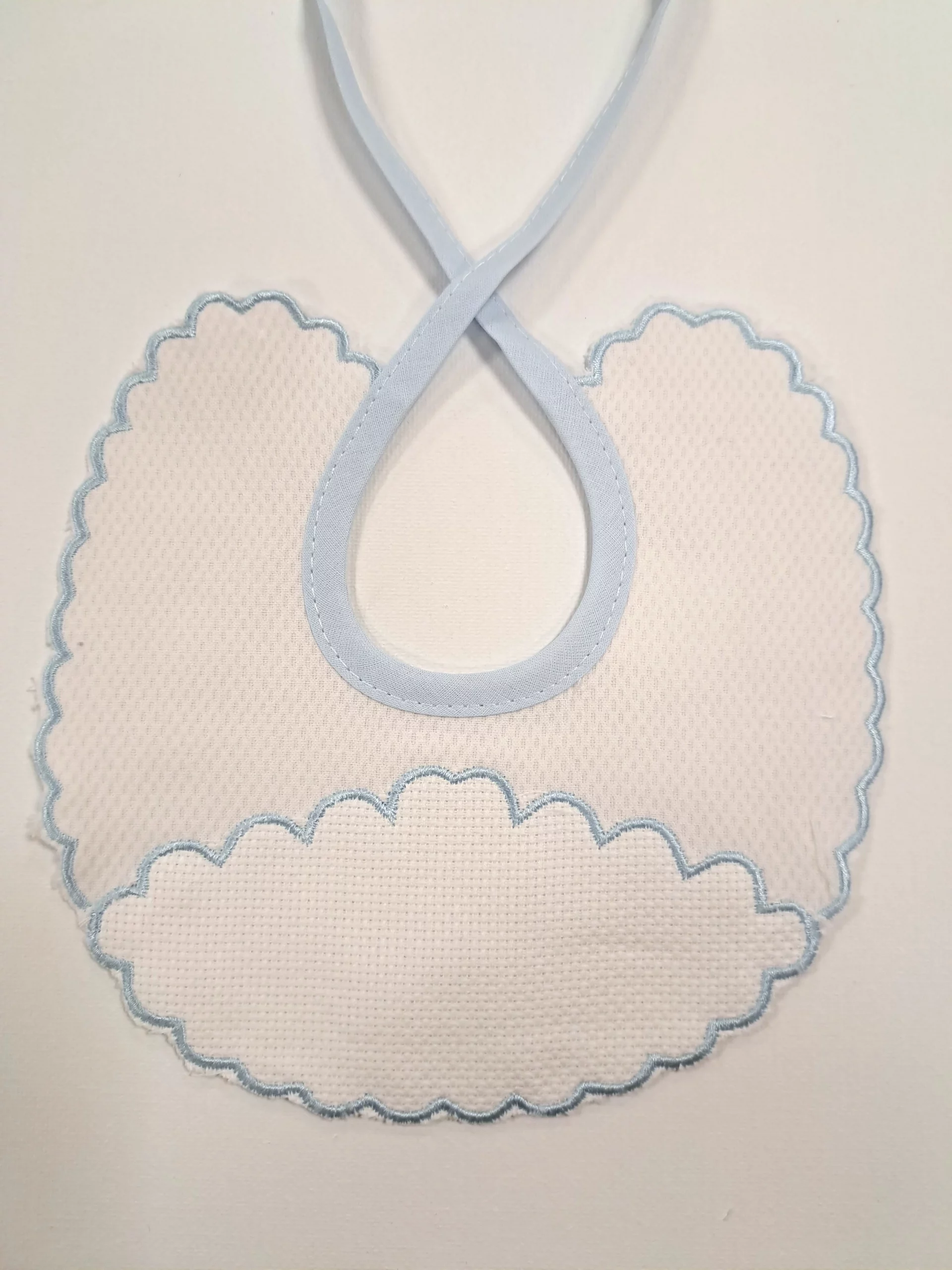 Babero con barra de panamá para poder bordar a punto de cruz y de suave pique. El babero va ribeteado con un bordado en azul . «Colección Punto de Cruz». Fabricado por Martifanel en Portugal.