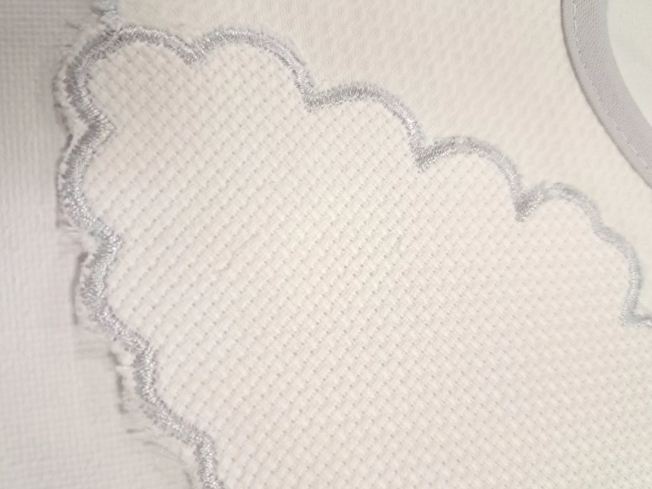Babero con barra de panamá para poder bordar a punto de cruz y de suave piquet, es un babero elegante para estar de paseo. Va ribeteado en gris y el tipo de cierre es de atar . Es 100% Algodón. «Colección Punto de Cruz». Fabricado por Martifanel en Portugal.
