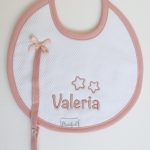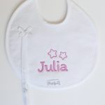 Babero redondo de piqué con chupetero y lacito. Parte trasera de felpa y la delantera de piqué. Nombre Personalizado bordado con dos estrellitas en el color del ribete, en la parte inferior del babero. Puede hacerse en otras medidas. Colección “Estrellitas”. Color “Blanco/Gris”. Marca Martifanel. Fabricado en Portugal.