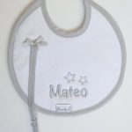 Babero redondo de piqué con chupetero y lacito. Parte trasera de felpa y la delantera de piqué. Nombre Personalizado bordado con dos estrellitas redondeadas en el color del ribete, en la parte inferior del babero. Puede hacerse en otras medidas. Colección “Estrellitas”. Color “Blanco/Maquillaje”. Marca Martifanel. Fabricado en Portugal.