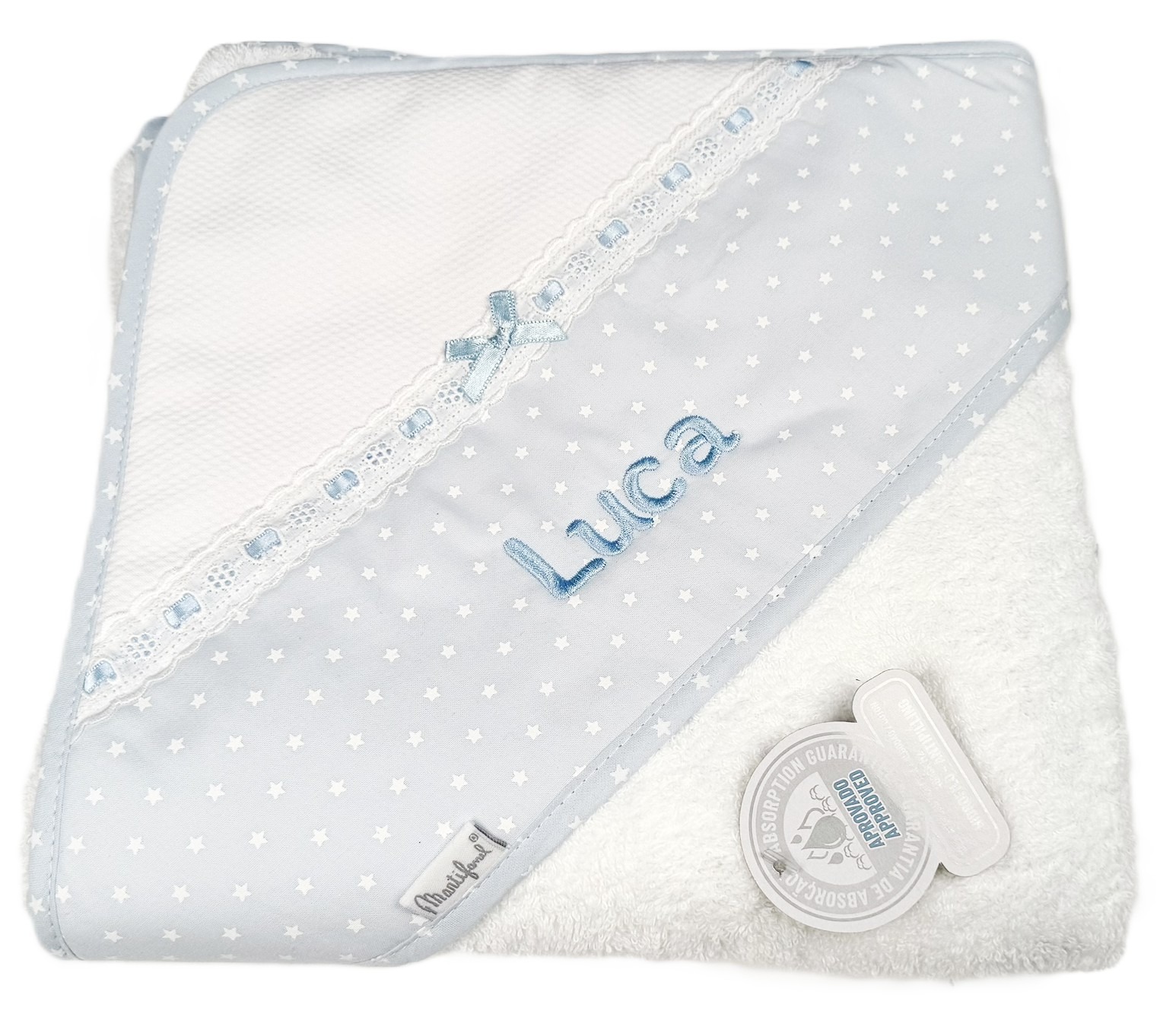 Capa de baño de bebé de 80 cm. Colección «Estrellitas» en color «Blanco/Azul». Al llevar capucha, permite secar la cabecita de tu bebé con rapidez y evitar coger frío. Es posible hacerla en otros tamaños. La toalla de estupenda calidad lleva capucha en una esquina decorada con piquet en la parte superior y en la inferior una barra de la tela de estrellitas, puntilla, cinta y lazo a juego. Fabricado por Martifanel en Portugal, en 100% algodón ultra suave, confeccionado con tejidos hidrófilos y antipilling para evitar la formación de bolitas. Fabricación en Portugal. Marca Martifanel.