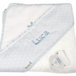 Capa de baño de bebé de 80 cm. Colección “Estrellitas” en color “Blanco/Gris”. Al llevar capucha, permite secar la cabecita de tu bebé con rapidez y evitar coger frío. Es posible hacerla en otros tamaños. La toalla de estupenda calidad lleva capucha en una esquina decorada con piquet en la parte superior y en la inferior una barra de la tela de estrellitas, puntilla, cinta y lazo a juego. Fabricado por Martifanel en Portugal, en 100% algodón ultra suave, confeccionado con tejidos hidrófilos y antipilling para evitar la formación de bolitas. Fabricación en Portugal. Marca Martifanel.