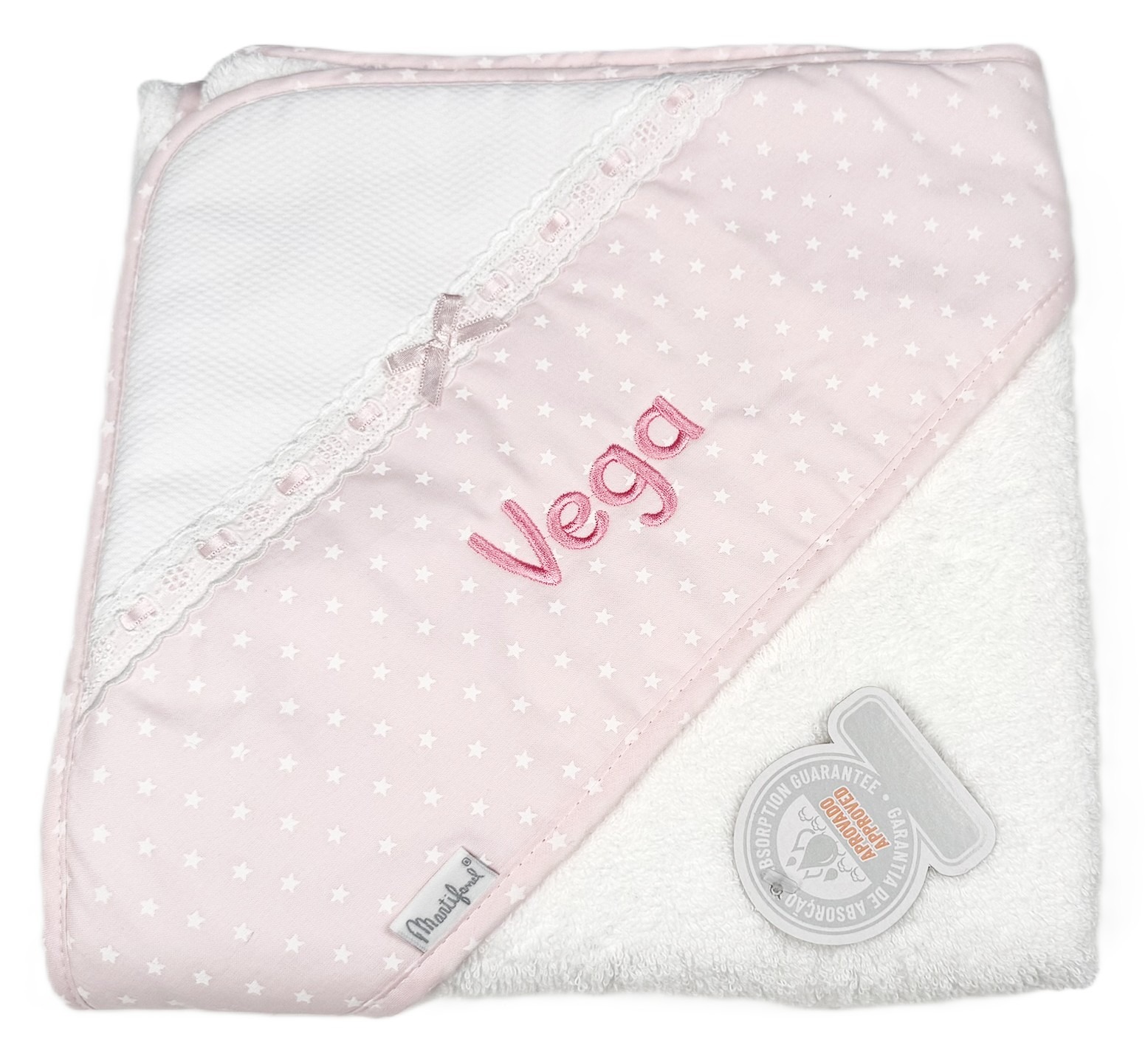 Capa de baño de bebé de 80 cm. Colección «Estrellitas» en color «Blanco/Rosa». Al llevar capucha, permite secar la cabecita de tu bebé con rapidez y evitar coger frío. Es posible hacerla en otros tamaños. La toalla de estupenda calidad lleva capucha en una esquina decorada con piquet en la parte superior y en la inferior una barra de la tela de estrellitas, puntilla, cinta y lazo a juego. Fabricado por Martifanel en Portugal, en 100% algodón ultra suave, confeccionado con tejidos hidrófilos y antipilling para evitar la formación de bolitas. Fabricación en Portugal. Marca Martifanel.