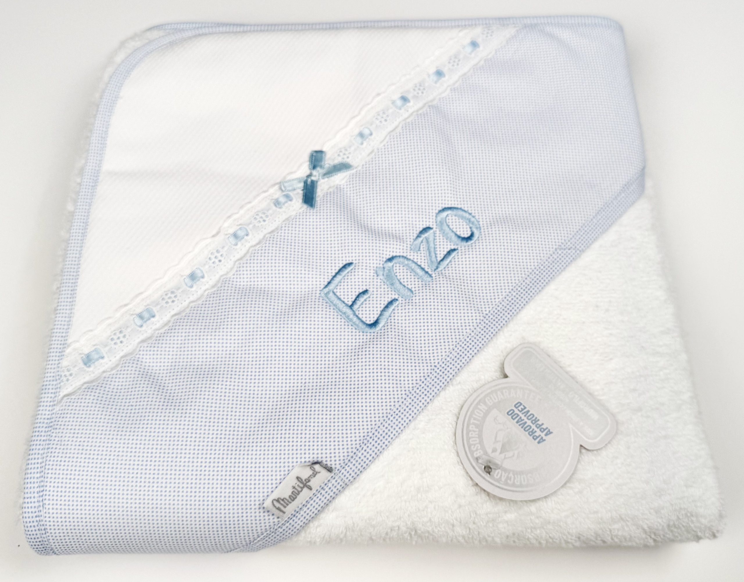 Capa de baño de bebé de 80 cm. Colección «Topitos» en color «Blanco/Azul». Al llevar capucha, permite secar la cabecita de tu bebé con rapidez y evitar coger frío. Es posible hacerla en otros tamaños. La toalla de estupenda calidad lleva capucha en una esquina decorada con piquet en la parte superior y en la inferior una barra de la tela de topitos, puntilla, cinta y lazo a juego. Fabricado por Martifanel en Portugal, en 100% algodón ultra suave, confeccionado con tejidos hidrófilos y antipilling para evitar la formación de bolitas. Fabricación en Portugal. Marca Martifanel.