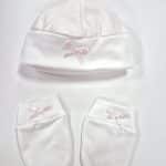 Suave conjunto de gorrito bebé con manoplas a juego. Ideal para recién nacidos para sus primeros días en el hospital. Marca Martifanel. Fabricado en Portugal.