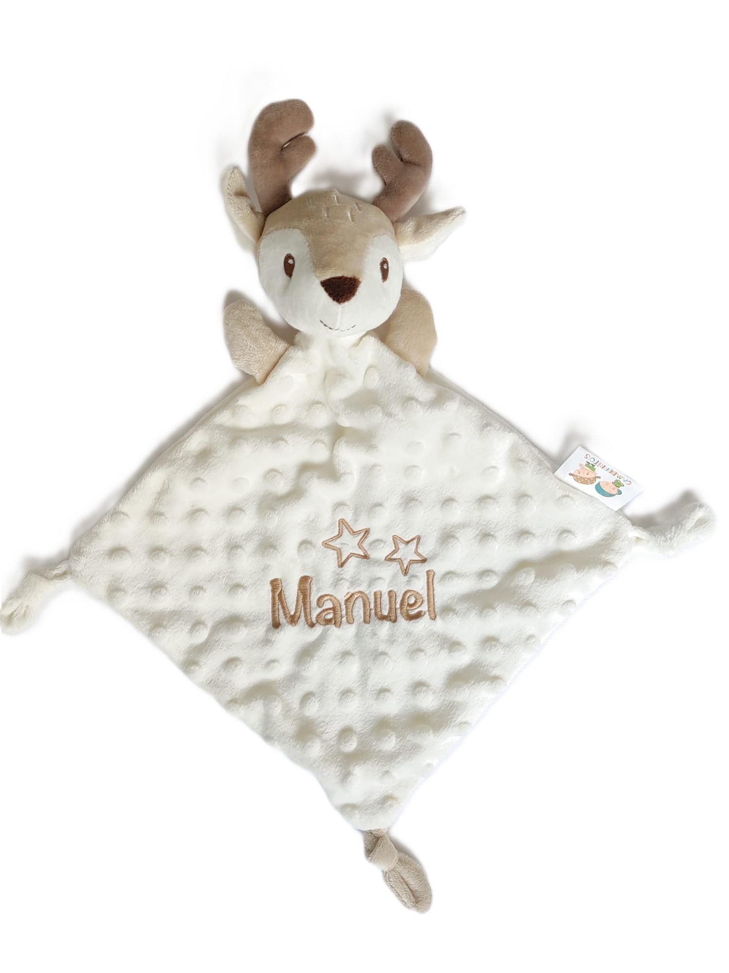 Dou-dou para bebé. El primer muñeco de tu bebé, consta de pañito que les encanta coger con la manita con 3 nudos en las esquinas y cabeza de Reno en la última esquina. de tela doble, la delantera con topitos y la trasera lisa. Se presenta en su caja de cartón con una ventana para poder ver lo que está dentro. Nombre Personalizado bordado con dos estrellitas acabada en picos si es niño y redondeadas si es niña, en el color del nombre. Color Beige. Bordado en color Beige dorado. Marca Gamberritos. Importado por Casa Dorada del Mediterráneo, S. L.