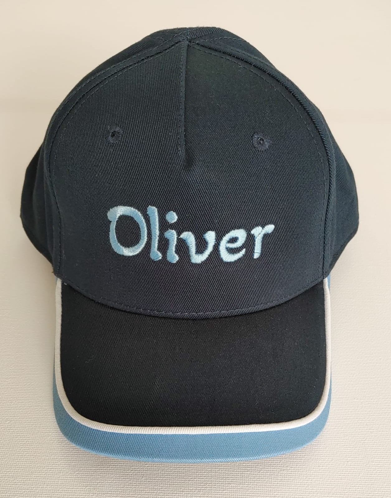 Gorra infantil personalizada con nombre. Color Marino, con detalle en solapa azul y blanco. Bordado en azul. Fabricada en 100% algodón orgánico. Cierre ajustable. Talla entre 3 y 12 años dependiendo de la circunferencia de la cabeza, este modelo es de 54 cm. Orificios bordados de ventilación. Se personaliza en el panel delantero de la gorra.