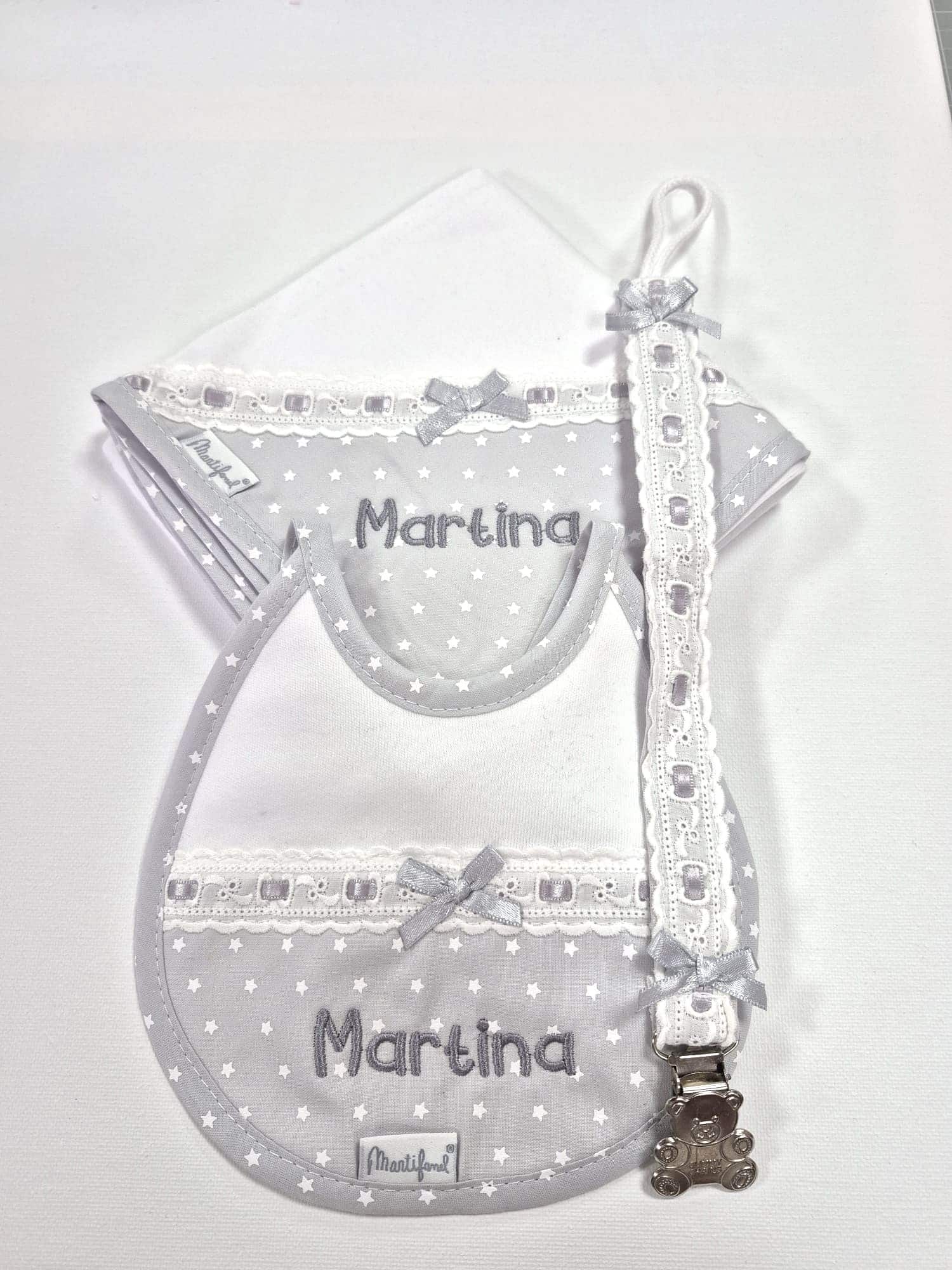 Conjunto para bebé con gasita, babero con cinta para el chupete y chupetero. La gasita lleva una esquina decorada con la tela de estrellitas, puntilla, cinta y lazo a juego. El babero tiene la parte trasera de felpa y la delantera decorada con la tela de gasa en la parte superior y la inferior decorada con la tela estampada de estrellitas, puntilla, cinta y lazo a juego. El chupetero está confeccionado con la puntilla, cinta y lazos en las puntas a juego y la trasera en la tela de estrellitas. Colección «Estrellitas». Color «Blanco/Gris». Fabricado por Martifanel en Portugal.