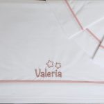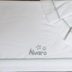 Juego de sábanas cuna en Blanco con festón en Beige. Colección “Mitasi”. Nombre Personalizado bordado en color Beige junto a dos estrellitas, en el centro de la encimera. Para cuna de 60×120. Puede hacerse para cochecito, mini-cuna y maxi-cuna, o a la medida que se requiera. Consta de sábana bajera, sábana encimera personalizada y funda de almohada. Marca Martifanel. Fabricado en Portugal.