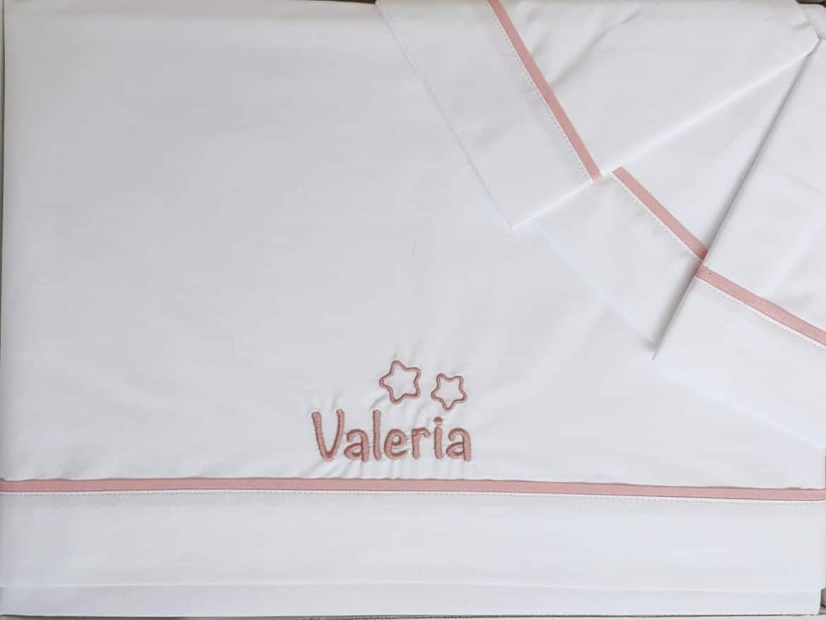 Juego de sábanas cuna en Blanco con festón en Maquillaje. Colección «Mitasi» Nombre Personalizado bordado en color Maquillaje junto a dos estrellitas redondeadas, en el centro de la encimera. Para cuna de 60×120. Puede hacerse para cochecito, mini-cuna y maxi-cuna, o a la medida que se requiera. Consta de sábana bajera, sábana encimera personalizada y funda de almohada. Marca Martifanel. Fabricado en Portugal.