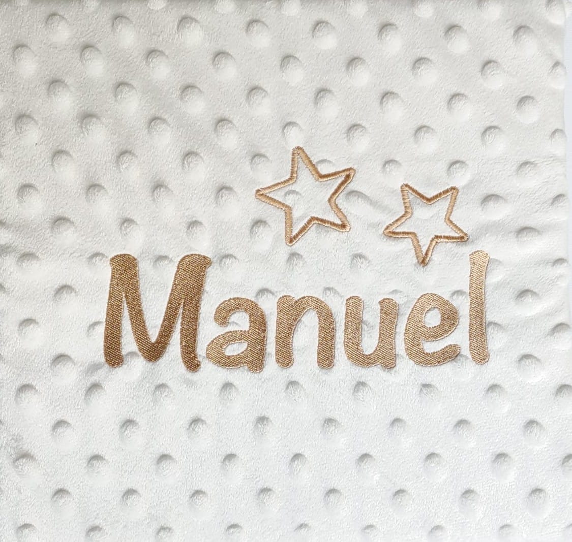 Mantita para bebé de 110×80. La primera mantita para tu bebé, para que se sienta arropado y le resguarde del frío. De alta calidad, es de doble tela, la delantera con topitos y la trasera lisa. Se presenta bien embalada en su caja de cartón por debajo y plástico imitando al cristal en la parte superior. Nombre Personalizado bordado con dos estrellitas acabada en picos si es niño y redondeadas si es niña, en el color del nombre. Color Beige. Bordado en color Beige Dorado. Existe en otros colores. Marca Gamberritos. Importado por Casa Dorada del Mediterraneo, S. L.