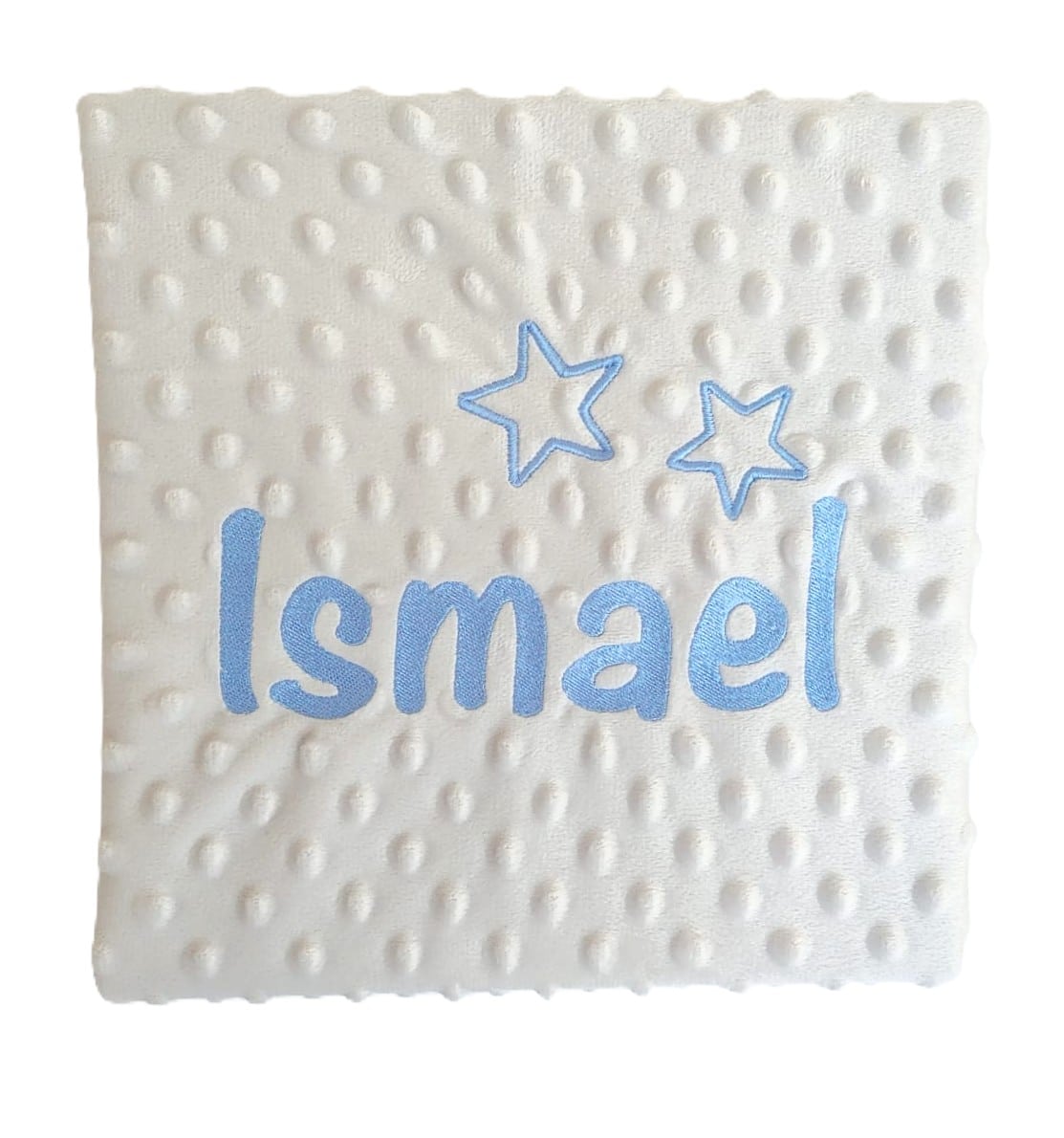Mantita para bebé de 110×80. La primera mantita para tu bebé, para que se sienta arropado y le resguarde del frío. De alta calidad, es de doble tela, la delantera con topitos y la trasera lisa. Se presenta bien embalada en su caja de cartón por debajo y plástico imitando al cristal en la parte superior. Nombre Personalizado bordado con dos estrellitas acabada en picos si es niño y redondeadas si es niña, en el color del nombre. Color Gris. Bordado en color Azul. Existe en otros colores. Marca Gamberritos. Importado por Casa Dorada del Mediterraneo, S. L.