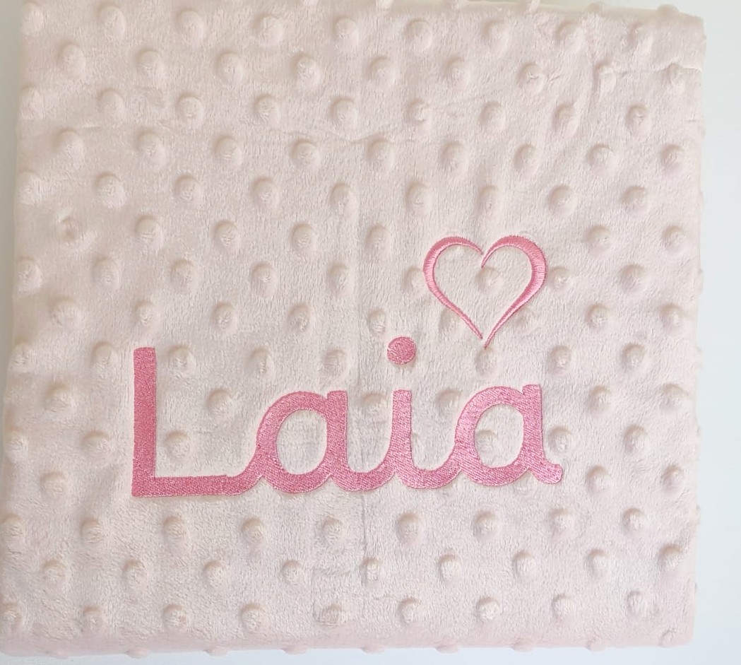 Mantita para bebé de 110×80. La primera mantita para tu bebé, para que se sienta arropado y le resguarde del frío. De alta calidad, es de doble tela, la delantera con topitos y la trasera lisa. Se presenta bien embalada en su caja de cartón por debajo y plástico imitando al cristal en la parte superior. Nombre Personalizado bordado con dos estrellitas acabada en picos si es niño y redondeadas si es niña, en el color del nombre. Color Rosa. Bordado en color Rosa. Existe en otros colores. Marca Gamberritos. Importado por Casa Dorada del Mediterraneo, S. L.