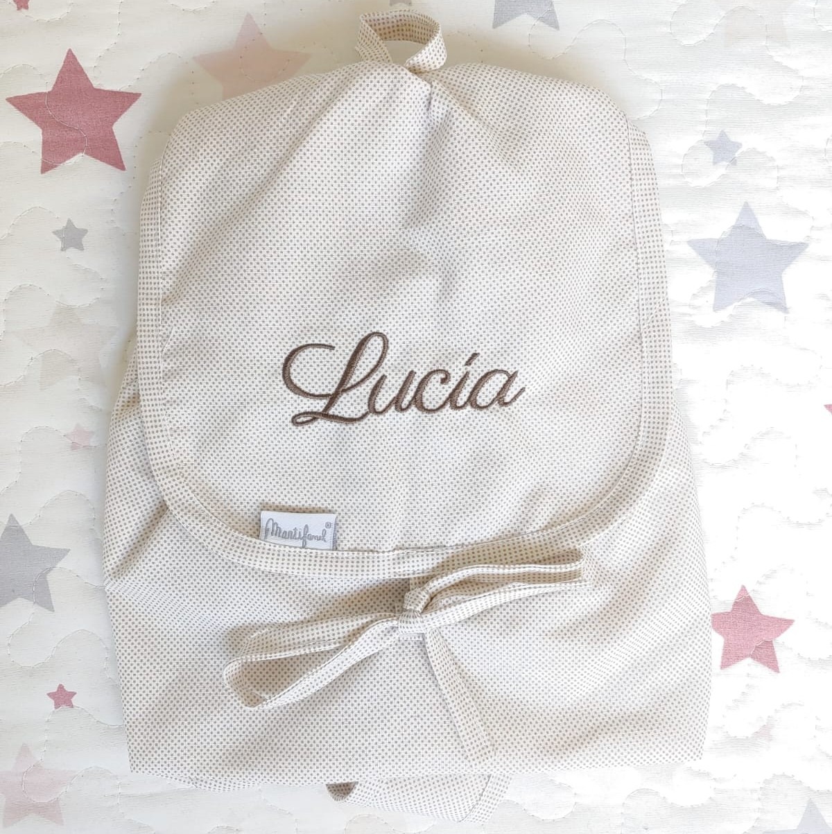 Bonita mochila para bebé colección «Topitos» en color «Beige». Diseñada con un bonito estampado de Topitos a tono, ideal para ir de excursión, llevar la merienda al parque o la muda a la guardería, hasta los 5 años aproximadamente. Se puede llevar de mano o colgada en la espalda. Colección «Topitos». Color «Beige». Fabricación portuguesa. Marca Martifanel.