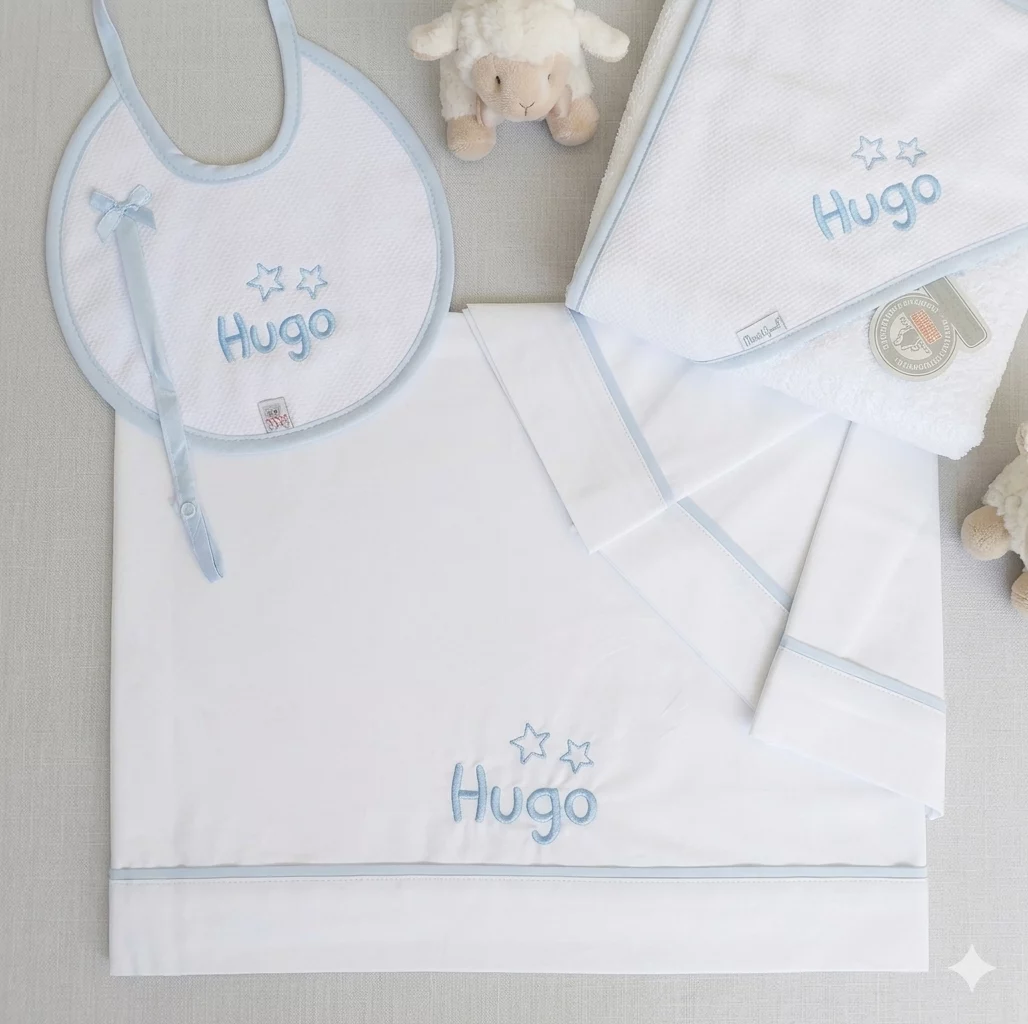 La toalla de bebé de 80 cm «Mitasi», elaborada en piqué blanco con ribete en azul, completa el conjunto con una estética coordinada y elegante. Su tamaño es ideal para envolver al bebé tras el baño, proporcionando suavidad, calidez y una excelente capacidad de absorción.
