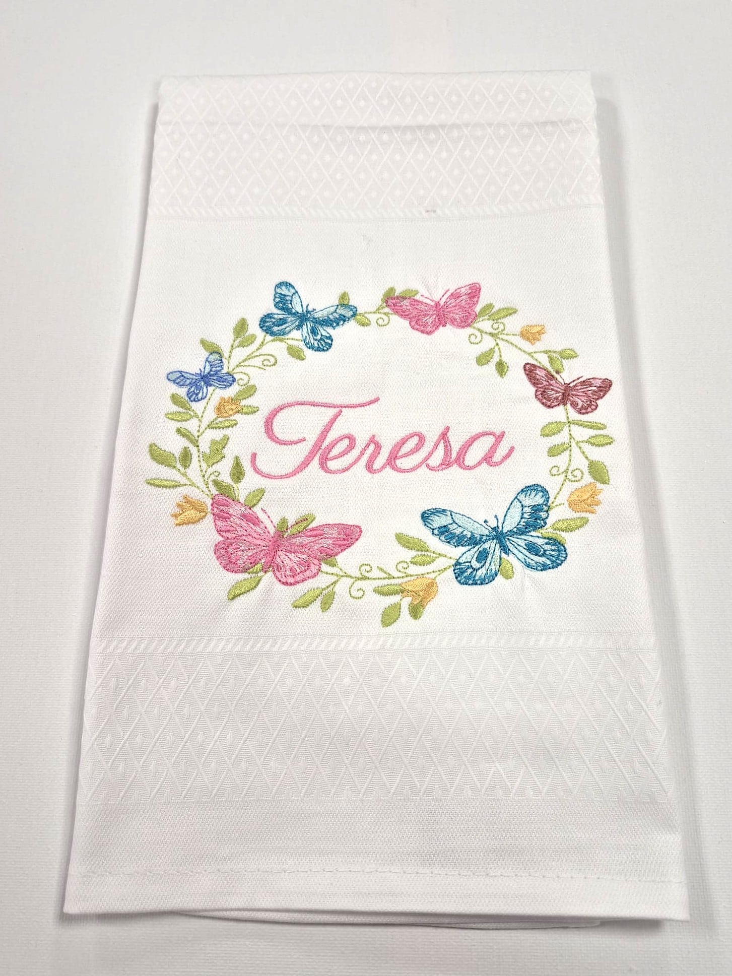 Paño de cocina 100% Algodón con mariposas formando un círculo dentro del cual bordamos el nombre que quieras. Ideal para regalar y demostrar a la persona todo lo que le aprecias y te acuerdas de ella. Fabricado en Portugal. Color del nombre en rosa.