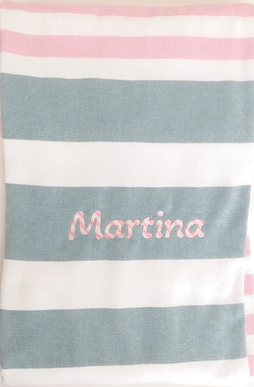 Pareo playa estampado en blanco con azul y rosa. Texto Personalizado bordado en color rosa multicolor, en la parte inferior centrado en el pareo. Con rizo suave y super absorbente en la parte de atrás y la delantera sin rizo para evitar enganchones. Fabricado en Portugal. Super ligero, apenas ocupa espacio. Con flecos en ambos lados. Además tiene un secado rápido.