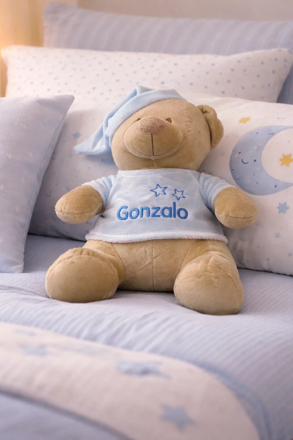 Peluche Osito con jersey en tono Azul. Precioso peluche con forma de un pequeño osito de la Colección de Gamberritos, este blandito compañero es perfecto para llevarlo a cualquier sitio o decorar su habitación. Con su tacto estimulante, ofrece diversión y confort. Ideal para regalar y proporcionar a tu bebe momentos de entretenimiento y bienestar. Bordado en un pequeño jersey desmontable, el peluche será el preferido de tu hijo. Importado por Casa Dorada del Mediterráneo, S. L.