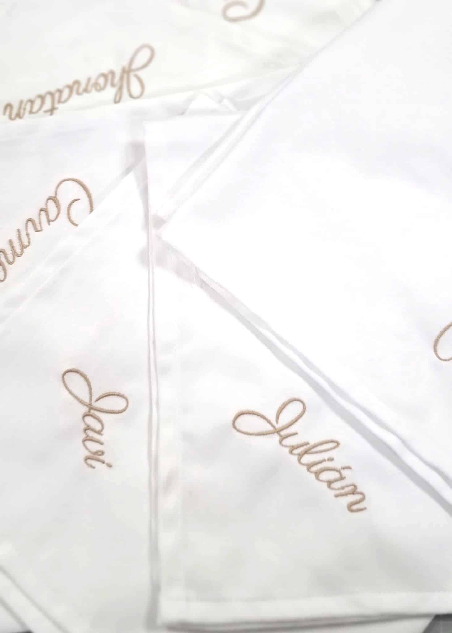 Servilleta de tela o lino, varios colores, personalizadas con nombre, apellido, logo, etc, para cualquier tipo de evento, bautizos, comuniones, bodas, cenas familiares. Pida presupuesto.