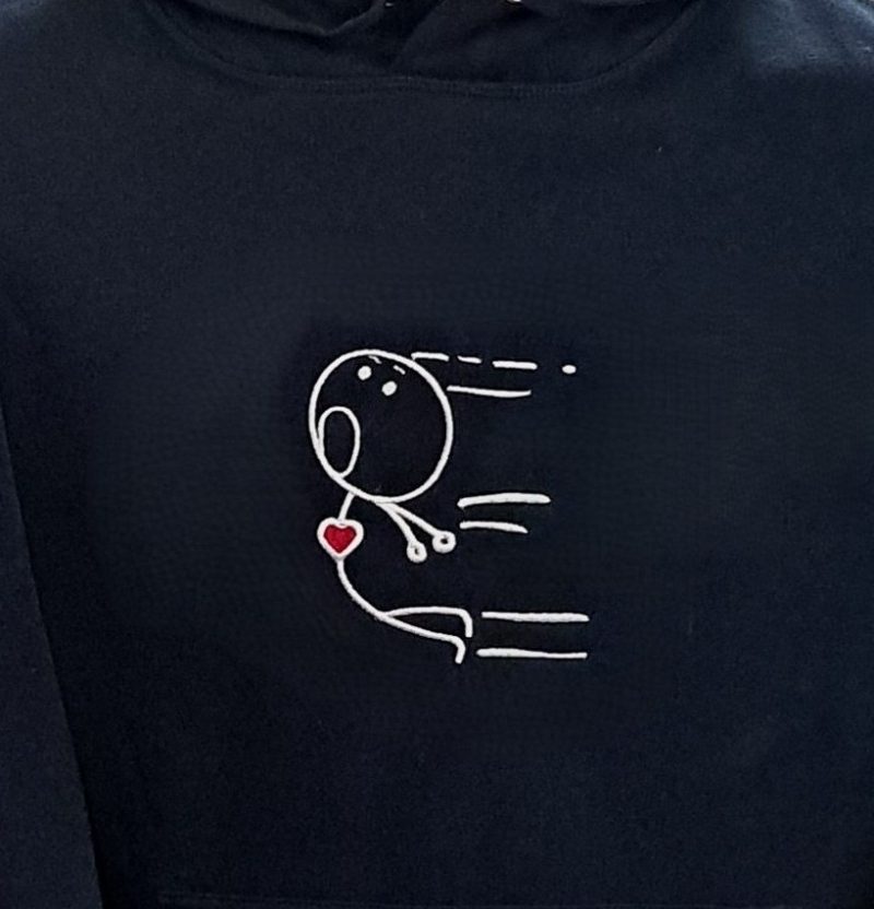 Sudadera sin capucha de tacto suave. Tejido fino. Cintura elástica. Color Marino, en tallas S, M, L, XL y XXL. El tallaje es REGULAR FIT. Modelo Unisex. Fabricada en Portugal. Bordada con diseño «Novio con imán» en zona lumbar izquierda. Colores a utilizar, blanco para el muñeco y rojo para el imán.
