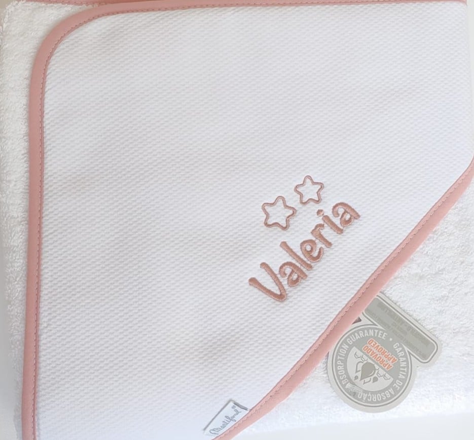 La toalla de baño Martifanel, de la colección «Mitasi», al llevar capucha, permite secar la cabecita de tu bebé con rapidez y evitar coger frío. Su tamaño es de 80 cm y tenemos la posibilidad de hacerla más grande. Fabricada en Portugal, en 100% algodón ultra suave, confeccionada con tejidos hidrófilos y antipilling para evitar la formación de bolitas. La capucha está fabricada en piqué, con rizo ultra suave en su interior y bordada con nombre y dos estrellitas encima del nombre a pico si fuese nombre de niño, o redondeadas si fuese nombre de niña. Permite bordar con cualquier color, díganos en comentarios si prefiere otro color.