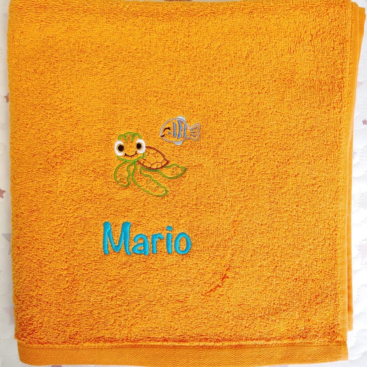 Toalla de playa infantil en color Naranja con imagen bordada de una Tortuga. Confeccionada en felpa esponjosa por lo cual también se puede utilizar en casa. Nombre Personalizado bordado en color Turquesa. Rizo suave y super absorbente por delante y terciopelo por debajo para impedir que se pegue la hierba de la piscina o la arena de la playa. Gramaje 400 gr/m2. De 100% Algodón. Fabricado en Portugal.