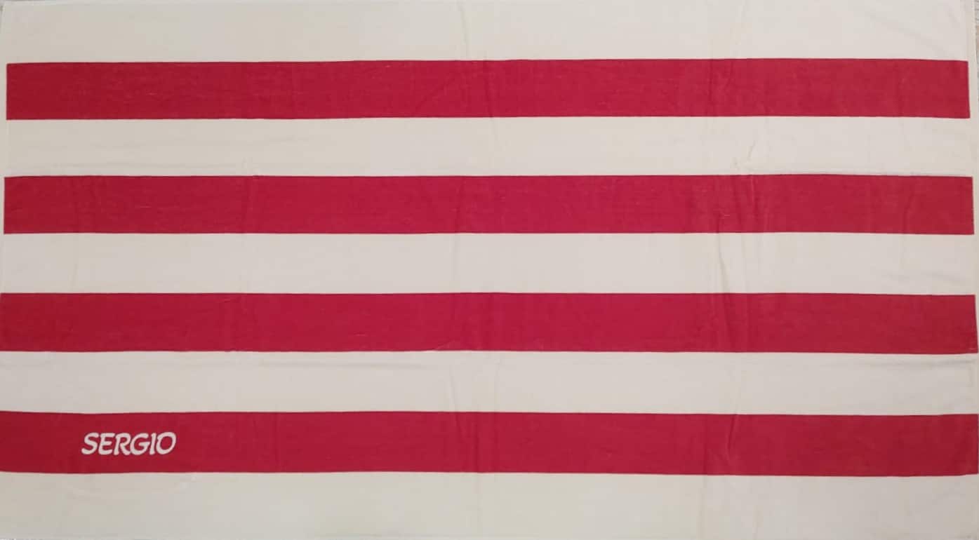 Toalla de playa estampada en rayas beige y granate. Texto Personalizado bordado en color beige en una raya granate en la parte inferior. Con rizo suave y super absorbente en la parte de atrás y la delantera en terciopelo para evitar enganchones. Tamaño 180×100 cm. Gramaje de 400gr/m2. Fabricado en Portugal.