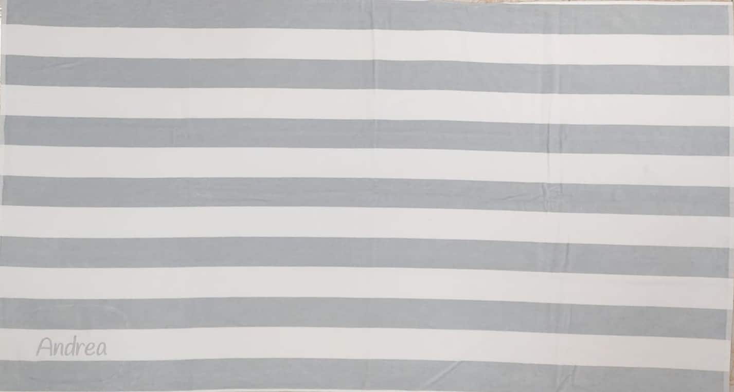 Toalla de playa estampada en rayas blanco y gris. Texto Personalizado bordado en color gris en una raya blanca en la parte inferior. Con rizo suave y super absorbente en la parte de atrás y la delantera en terciopelo para evitar enganchones. Tamaño 180×100 cm. Gramaje de 400gr/m2. Fabricado en Portugal.