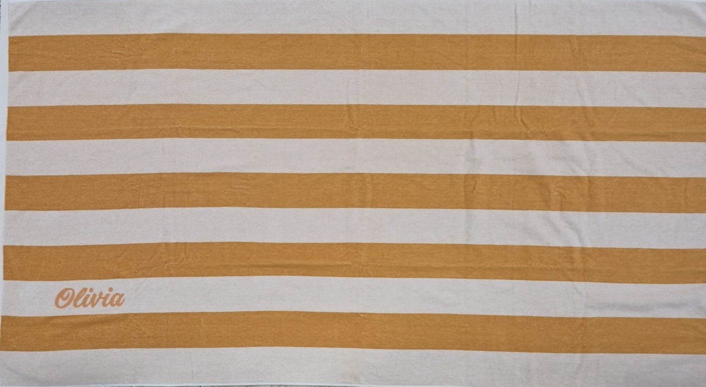 Toalla de playa estampada en rayas blanco y mostaza. Texto Personalizado bordado en color mostaza en una raya blanca en la parte inferior. Con rizo suave y super absorbente en la parte de atrás y la delantera en terciopelo para evitar enganchones. Tamaño 180×100 cm. Gramaje de 400gr/m2. Fabricado en Portugal.