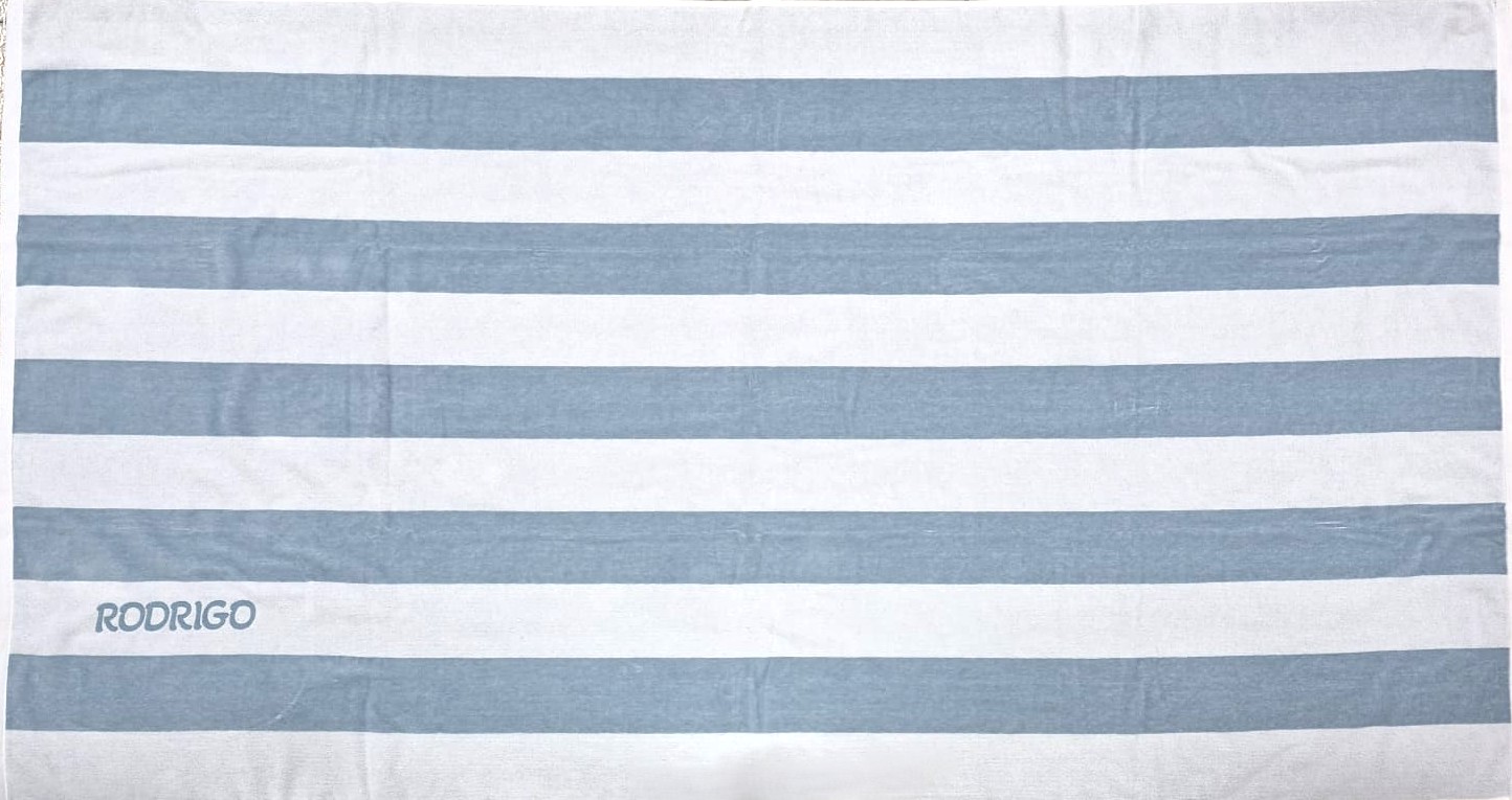 Toalla de playa estampada en rayas blanco y azul. Texto Personalizado bordado en color azul en una raya blanca en la parte inferior. Con rizo suave y super absorbente en la parte de atrás y la delantera en terciopelo para evitar enganchones. Tamaño 180×100 cm. Gramaje de 400gr/m2. Fabricado en Portugal.