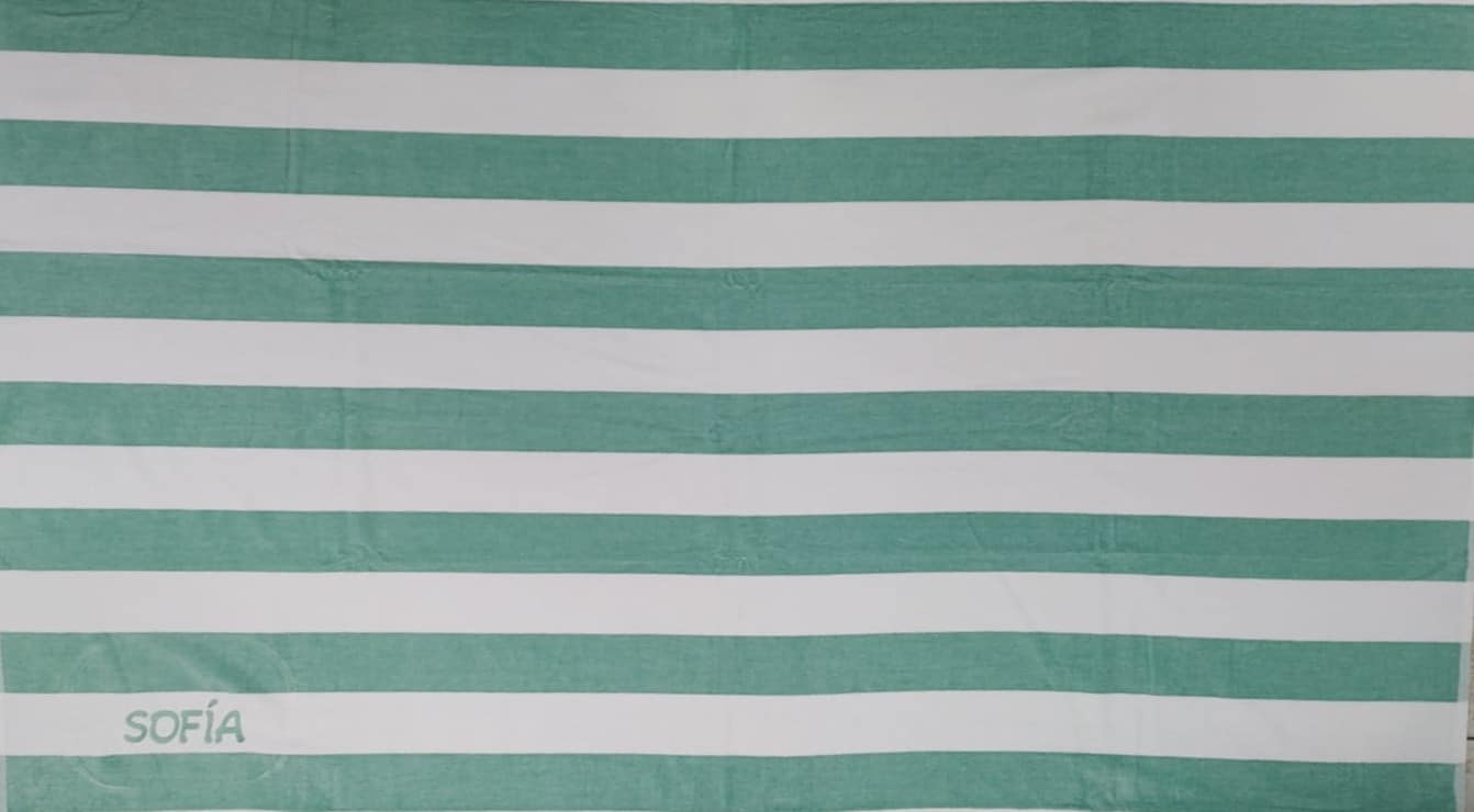 Toalla de playa estampada en rayas blanco y verde. Texto Personalizado bordado en color verde en una raya blanca en la parte inferior. Con rizo suave y super absorbente en la parte de atrás y la delantera en terciopelo para evitar enganchones. Tamaño 180×100 cm. Gramaje de 400gr/m2. Fabricado en Portugal.